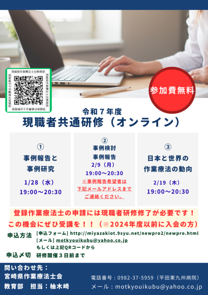 ①参加希望の方は宮崎県作業療法士会ホームページの現職者研修申込フォームからお申込みください。